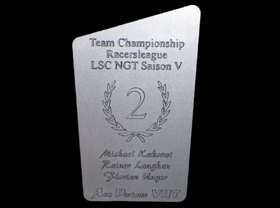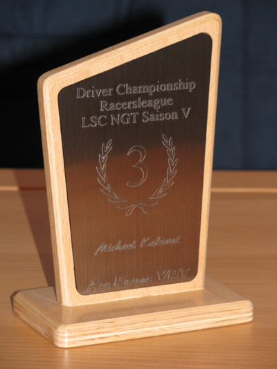 Die Trophäen sind aus Buche Schichtholz gemacht. Die eigentliche Gravurplatte ist aus 1,5mm dickem Kunststoff, welches dann Farblich beschichtet ist. Diese Platten gibt es in Unterschiedlichen Farben. Die Trophäen hab ich extra für mein Virtuelles Rennteam entworfen.